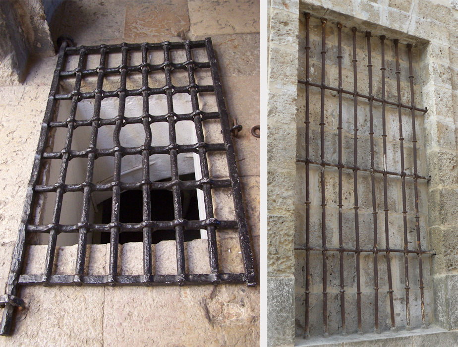 Ejemplos de rejas medievales de influencia romana. A la izquierda fotografía tomada en la Torre de Belém de Lisboa s. XVI, puerta ensamblada de acceso a los calabozos. Y a la derecha reja perteneciente a la ventana del crucero, de la Iglesia de S. Miguel de Palencia, s. XI-XII, este rtipo de barrotes de macollas forjadas es bastantye posterior, seguramente del s. XVII.