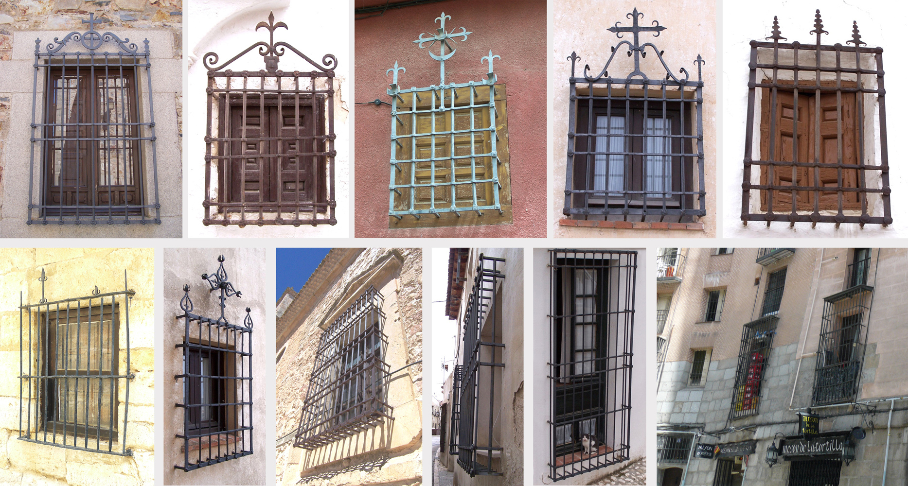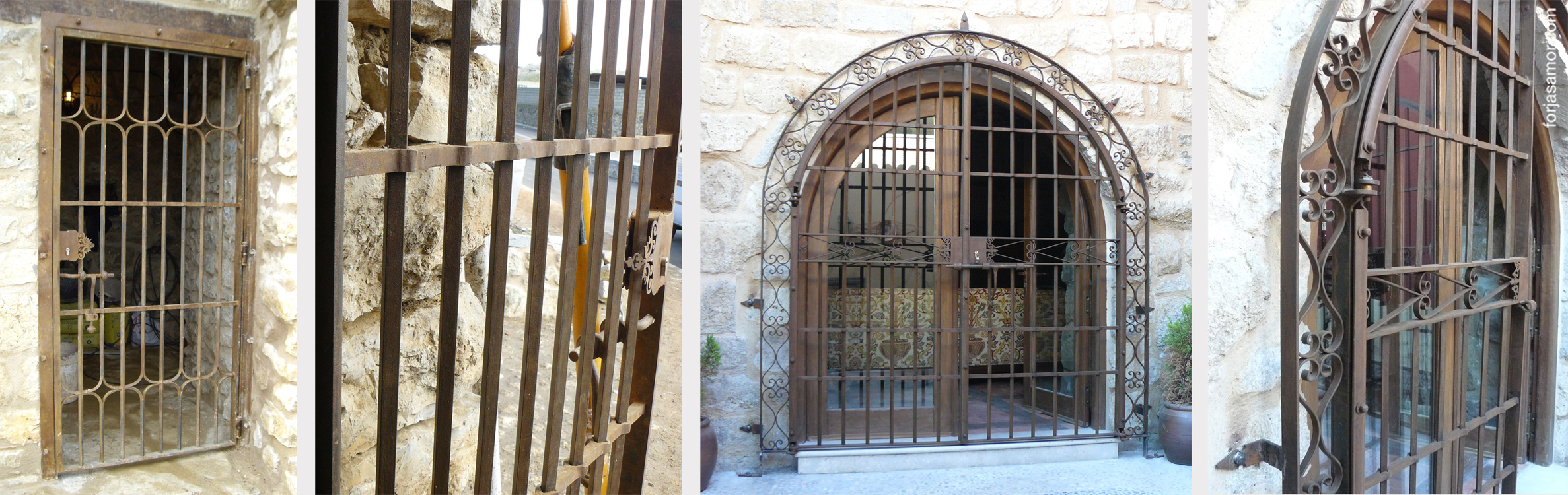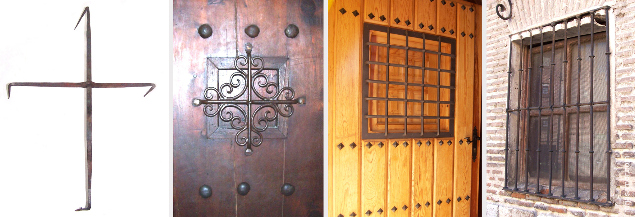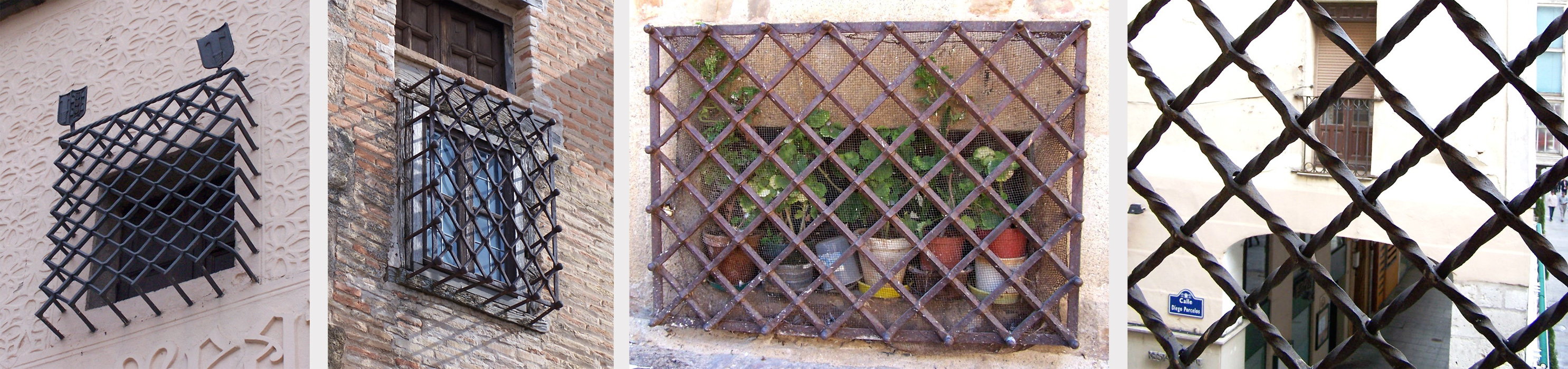 Ejemplos de rejas medievales modelo Convento. (de izquierda a derecha fotografías tomadas en Segovia, Toledo, Cáceres y la Catedral de Burgos)