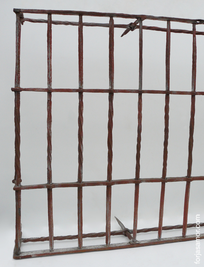 Ejemplos fabricados por Forjas Amor de rejas ensambladas de barrotes cuadrillados de tres y cuatro hembras, con barrotes pasantes cuadrillados dispuestos en ángulo.